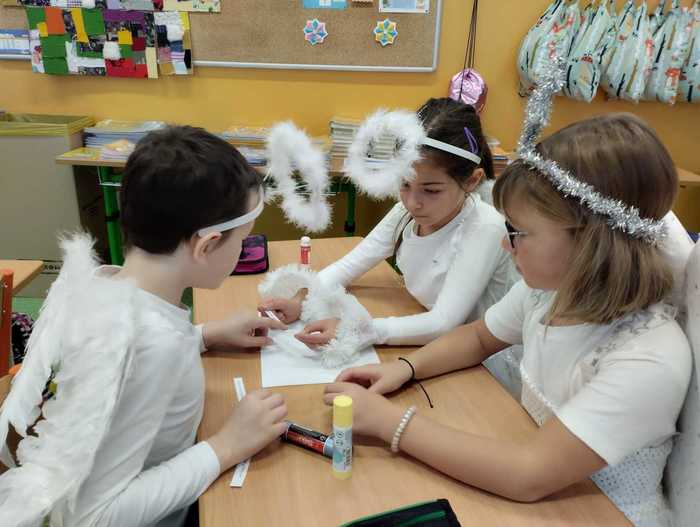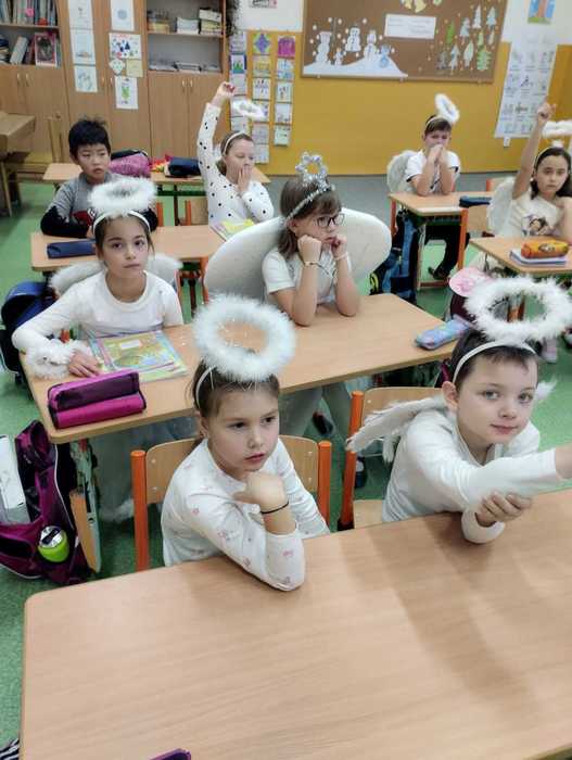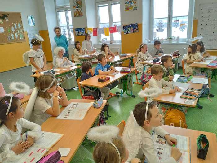 5. prosince se do naší třídy slétli andělé, aby s napětím očekávali příchod Mikuláše a jeho čertovského doprovodu. Andílci se vzorně učili, poslouchali a pro jistotu si opakovali říkanky a písničky pro Mikuláše. Přesto, že se na něj děti velmi těšily, na některých bylo možno pozorovat obavy z čertovské chásky a knihy hříchů. Nakonec se děti dočkaly, vše dobře dopadlo, říkanky byly odříkány, drobné dárečky rozdány a sliby o poslušnosti slíbeny. Tak se budeme těšit zase za rok!
