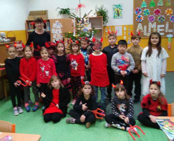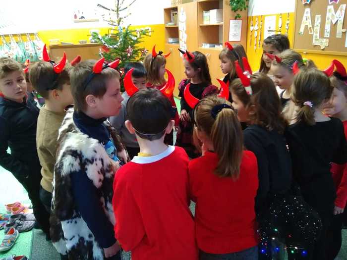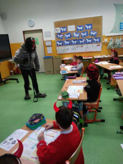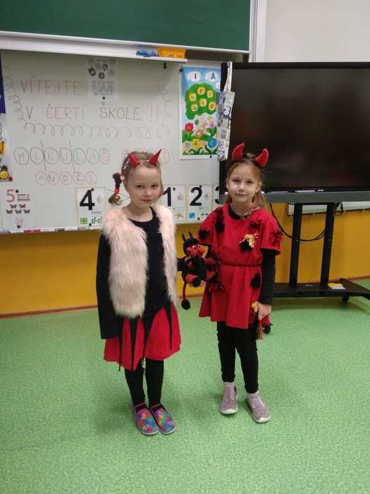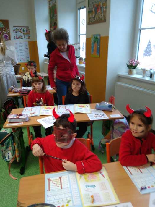V pondělí 5. prosince se to v obou prvních třídách hemžilo čertíky a andělíčky. Tento den jsme měli Čertí školu. Učení se neslo v čertovském duchu, plnili jsme po čertech těžké úkoly. Nejen čtení a psaní, ale i učení básniček pro Mikuláše, tanečky o čertech, vaření čertovského guláše, nám šlo pěkně od ruky. Děti však netrpělivě vyhlížely návštěvu velkých čertů s Mikulášem, některým se v očích zračila obava i strach. Nakonec vše dobře dopadlo, děti dostaly od Mikuláše sladkou nadílku a těšily se na večer.