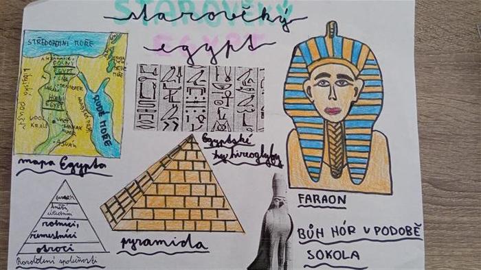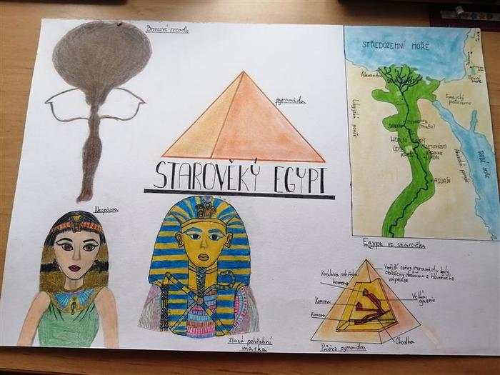 Starověký Egypt - dějepisný projekt žáků 6. třídy. Od žáků 6. třídy obrázek znázorňující tkalcovský stav z doby kamenné (děti vyráběly pravěké modely).